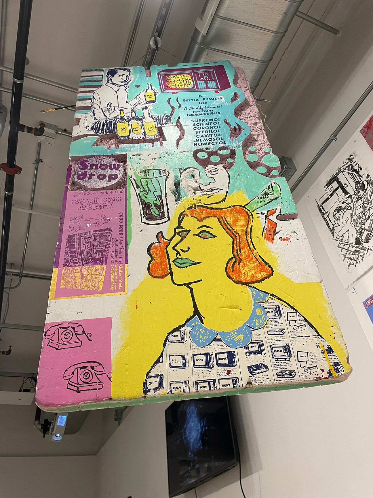 Some Stuff Going on in Chicago, 2023. Fall 2023 School of the Art Institute of Chicago Undergraduate Exhibition Installation. Mixed media on paper and found materials. 9’ x 9’ x 6’